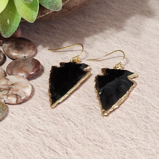 Obsidian Arrowhead Earrings - Gold Accent, Southwest Jewelry