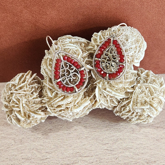 Beaded Teardrop Dangle Earrings - Silver Frame, Entwined Hearts